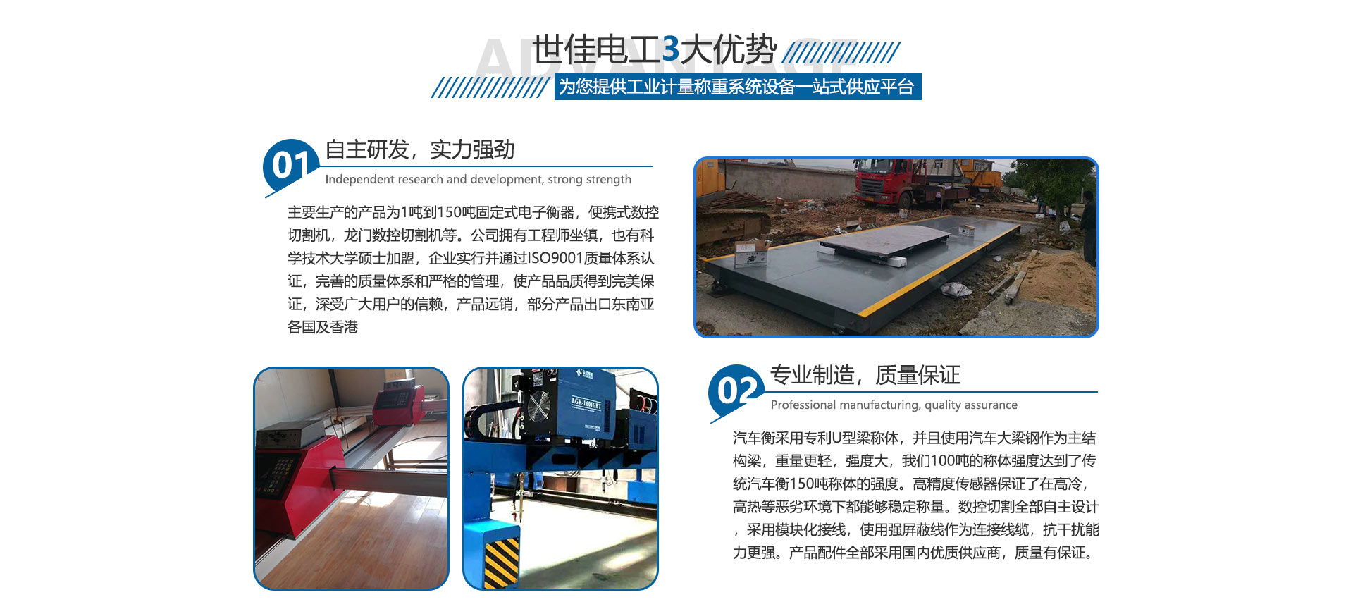 關于我們合肥世佳電工設備有限公司是生產、銷售工業自動化設備。主要生產的產品為1噸到150噸固定式電子衡器,便攜式數控切割機,龍門數控切割機等。公司擁有工程師坐鎮,也有中國科學技術大學碩士加盟,企業實行并通過ISO9001國際質量體系認證,完善的質量體系和嚴格的管理,使產品品質得到保證,深受廣大用戶的信賴,產品遠銷全國,部分產品出口東南亞各國及香港,數控切割設備也在安徽處于前列。我們并不滿足現在所取得的成就,公司繼續加大科研投入,正在和中科大物理研究所科研人員共同研究開發下一代衡器控制儀表,希望以技術作為突破口,將公司做大做強,為中華崛起盡自己一份綿薄之力。歡迎廣大客戶來廠參觀訂貨考察。